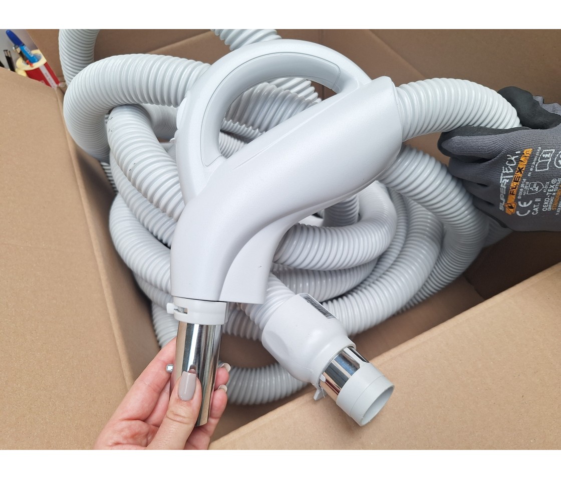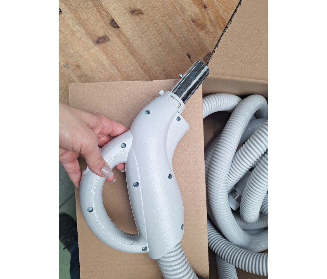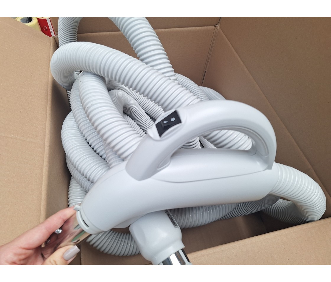 Elegancki wąż do odkurzacza centralnego o długości 10m. Wygodny, lekki i wytrzymały. Posiada ergonomiczny uchwyt z włącznikiem on/off do rury teleskopowej wraz z klipsem. Wąż posiada 5 lat gwarancji.
